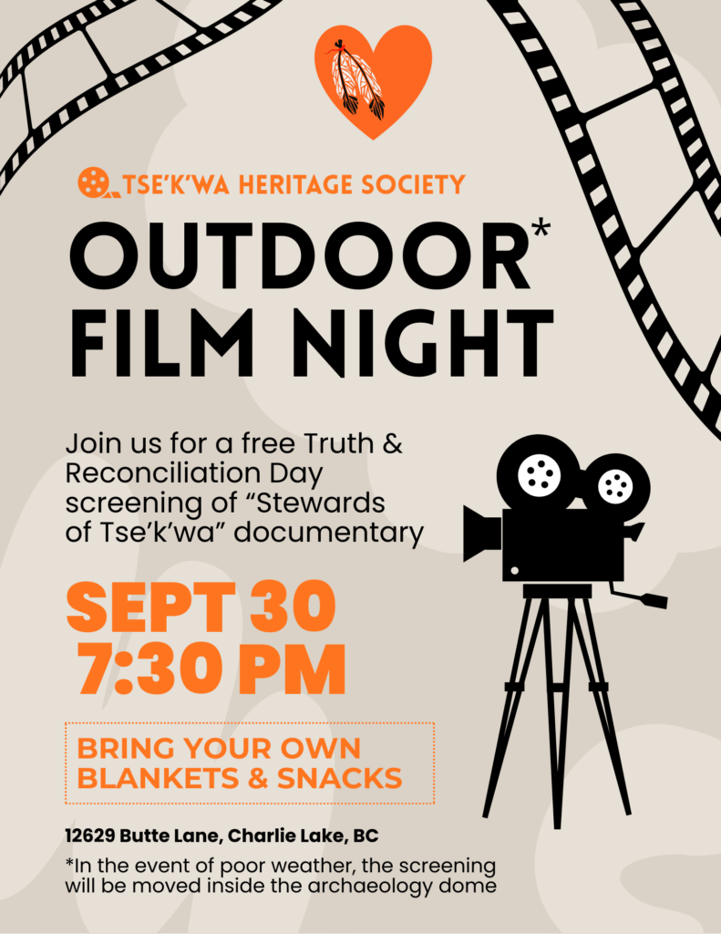 Tse’k’wa Heritage Society is pleased to invite you to a FREE Outdoor Film Night at Tse’k’wa on September 30th in recognition of Truth & Reconciliation Day. The film will begin at 7:30pm.