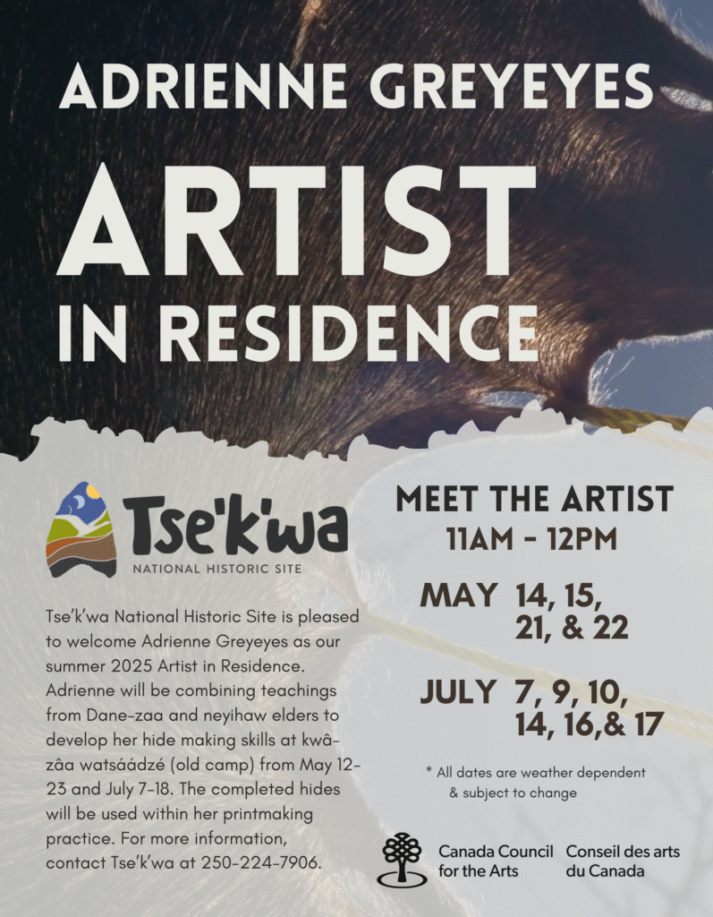 Tse’k’wa National Historic Site is pleased to welcome Adrienne Greyeyes as our summer 2025 Artist in Residence. Adrienne will be combining teachings from Dane-zaa and neyihaw elders to develop her hide making skills at kwâ-zâa watsáádzé (old camp) from May 12-23 and July 7-18. The completed hides will be used for her printmaking practice.